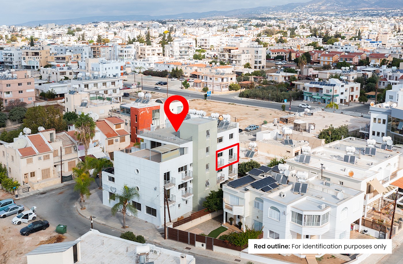 • Η άμεση περιοχή του ακινήτου χαρακτηρίζεται κυρίως από οικιστική ανάπτυξη αποτελούμενη από κατοικίες και συγκροτήματα/πολυκατοικίες διαμερισμάτων. Επίσης, επωφελείται από εύκολη πρόσβαση στην τουριστική περιοχή, στο κέντρο της Πάφου και στον αυτοκινητόδρομο Πάφου - Λεμεσού (Α6), όπως επίσης και σε υπηρεσίες όπως σχολεία, σούπερμαρκετ, πρατήρια βενζίνης, κ.α.
