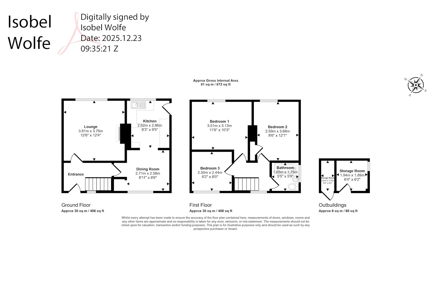First floor: Three bedrooms, bathroom/wc