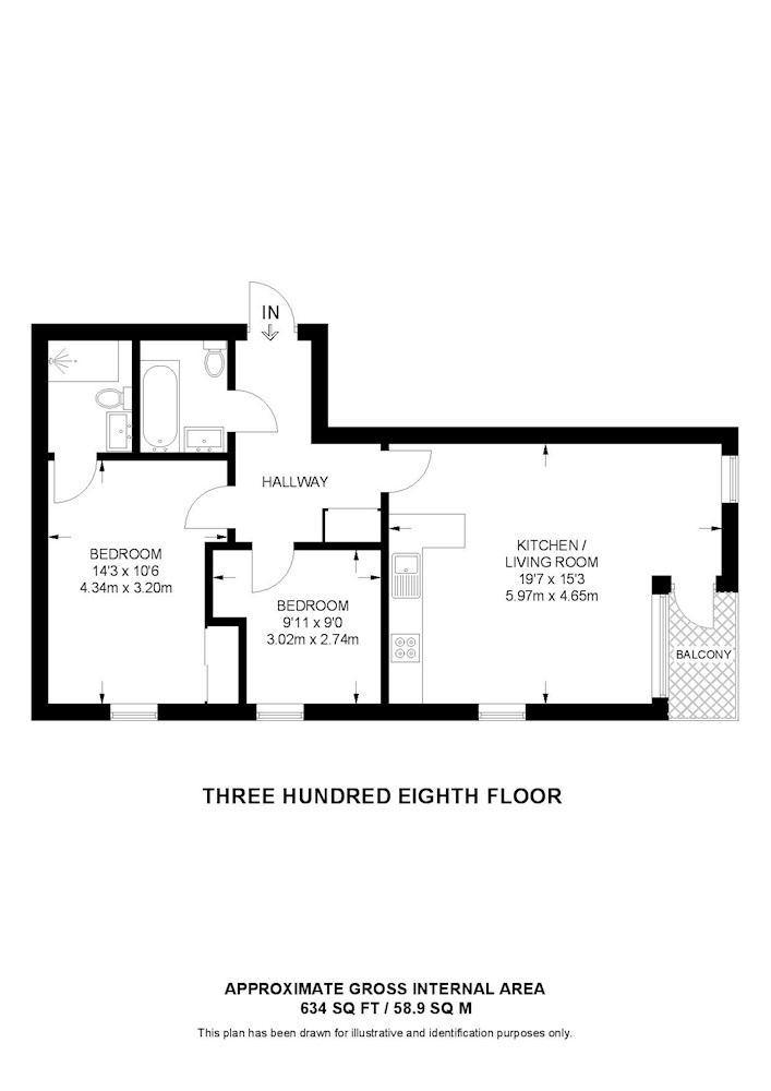 Kitchen/living room, two bedrooms, bathroom, shower room, balcony.