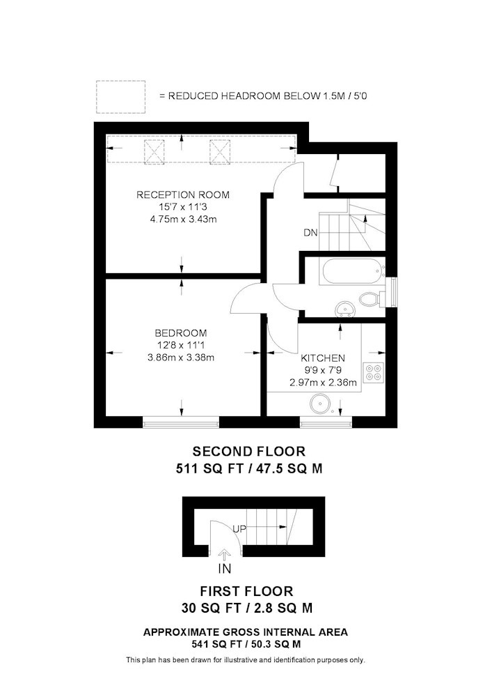 Second floor: reception room, kitchen, bedroom, bathroom.