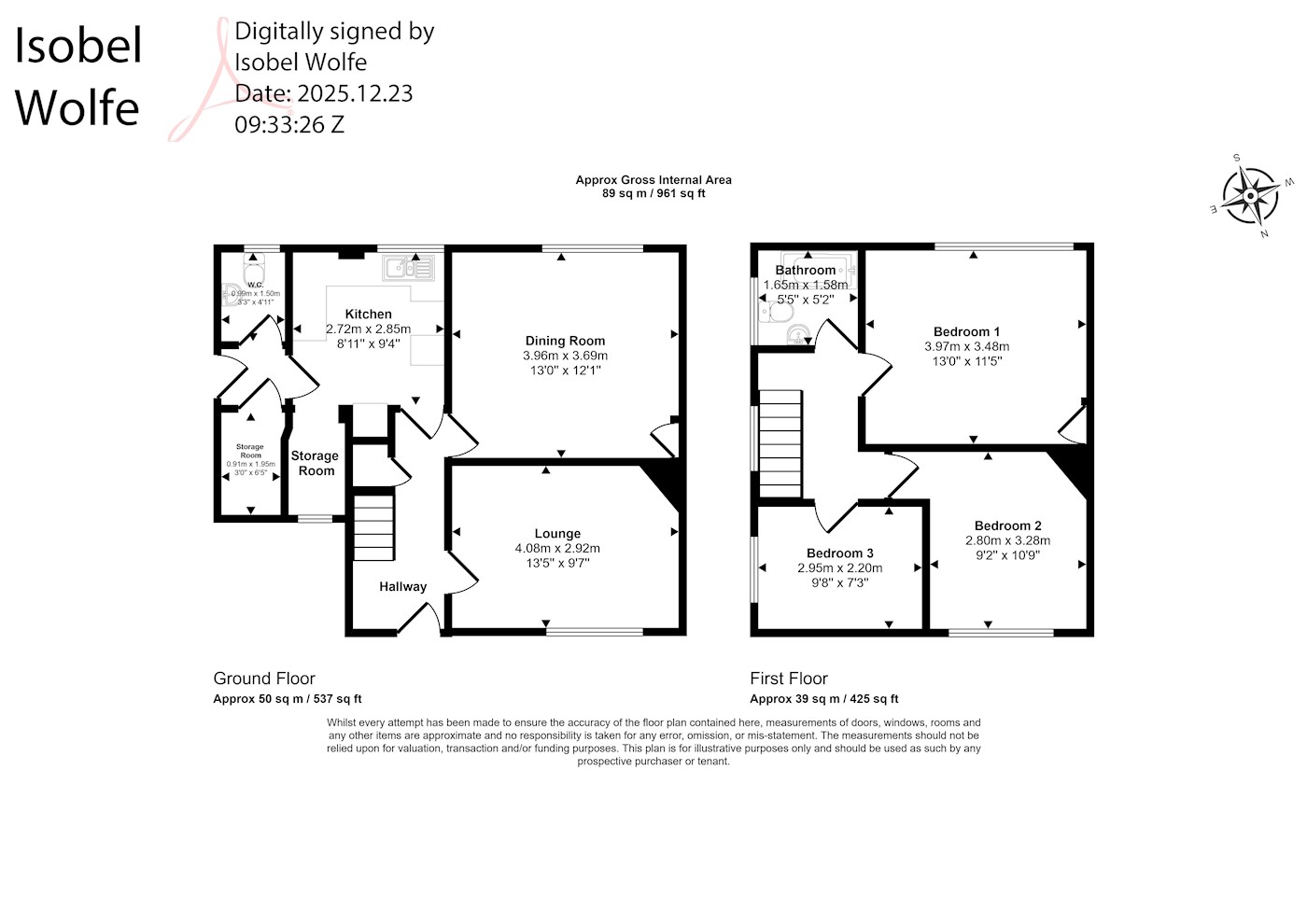 First floor: Three bedrooms, bathroom/wc