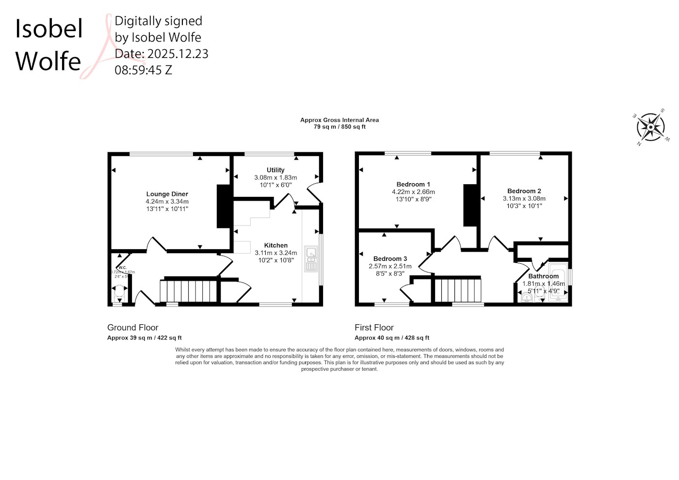 First floor: Three bedrooms, bathroom/wc
