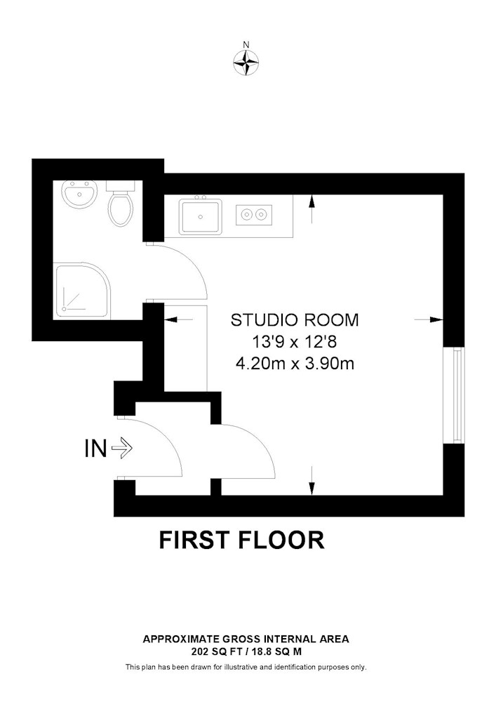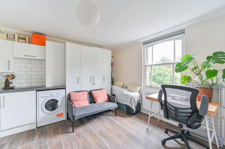 Situated on the first floor, this lovely studio flat features a well-proportioned studio room, open-plan kitchen and sleek shower room.