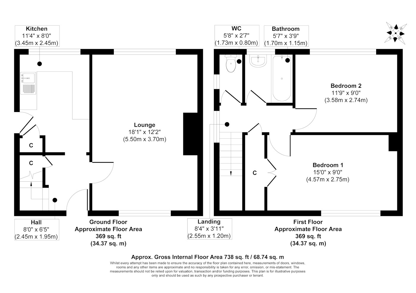 First floor: Two bedrooms, bathroom/wc