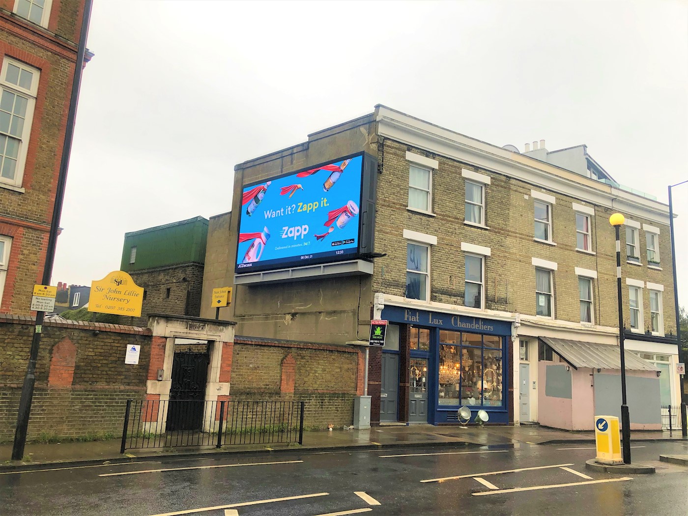 Lillie Road is a street in the north of Fulham, in the London Borough of Hammersmith and Fulham. A mixed residential and commercial road, it is the westerly continuation of Old Brompton Road, running from Lillie Bridge to Fulham Palace Road (the A219). Its main junctions are with North End Road and with Munster Road at Fulham Cross. The billboard is located on the flank wall on 245 Lillie Road on its south side near its junction with Pellant Road and next to Sir John Lillie Nursery and Primary School in a mixed use area. West Brompton station with its District line and London Overground services are the eastern commencement of Lillie Road. There are also numerous London Buses passing the billboard.