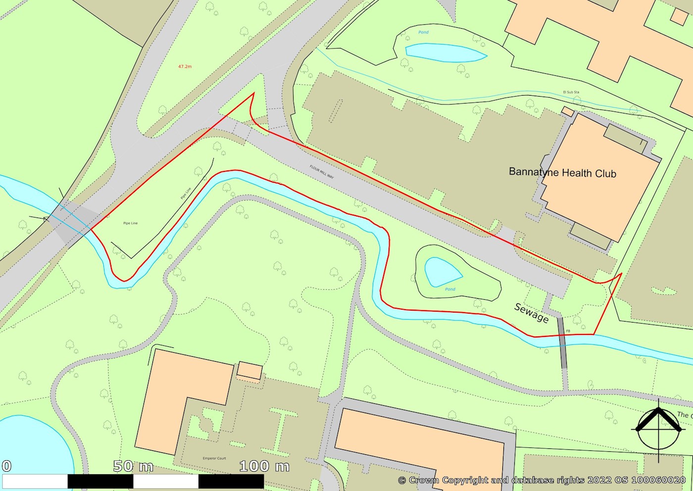 An irregular shaped parcel of land totalling approximately 0.51 hectares (1.27 acres). The land includes Flour Mill Way, which is an adopted highway and the access road to Bannatyne Health Club. The remainder of the land is grass verges and woodland.