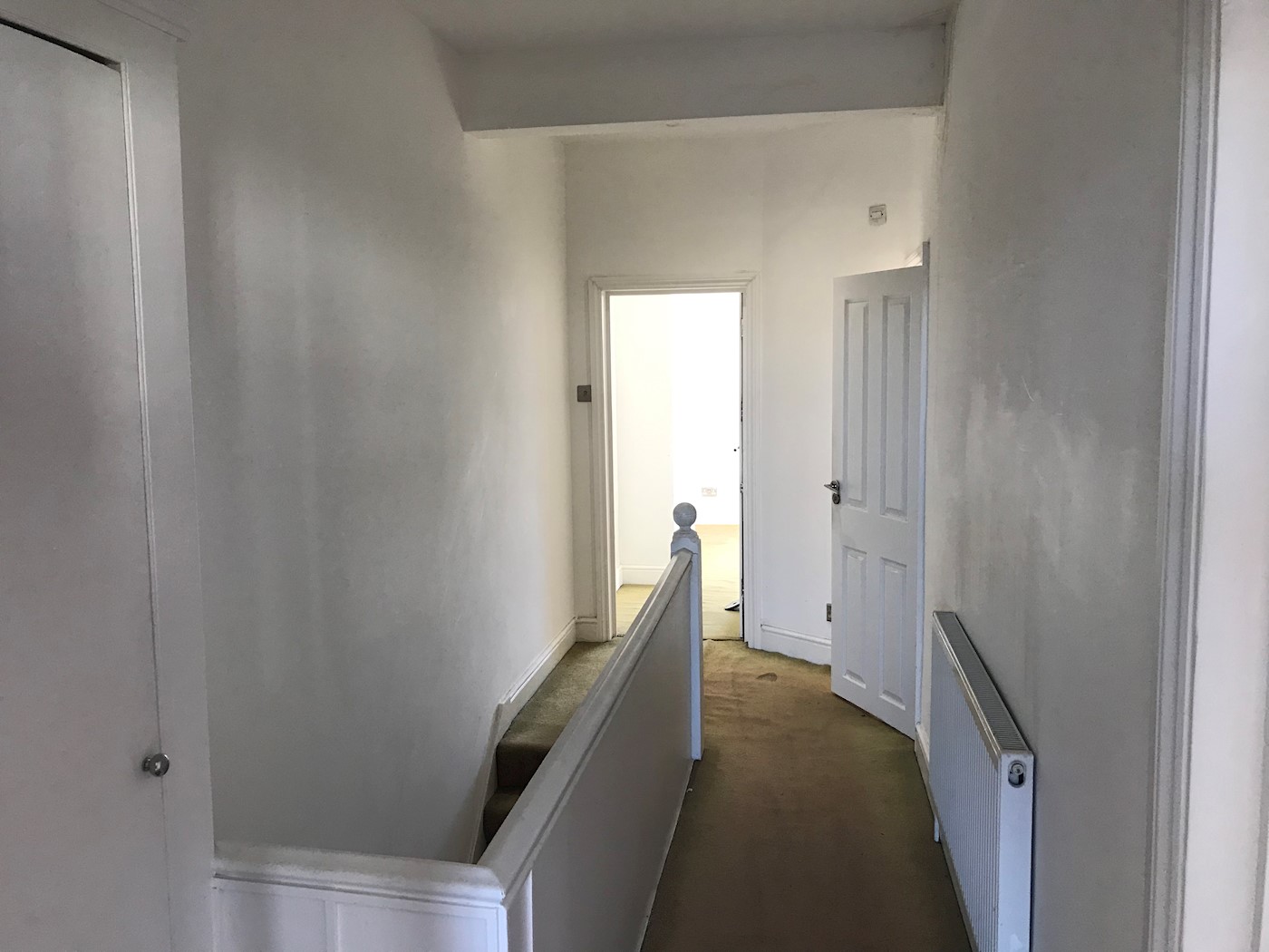 Entrance door into hallway with stairs leading up to first floor landing comprising smooth ceiling with ceiling lighting, storage cupboard, carpeted flooring, doors to: