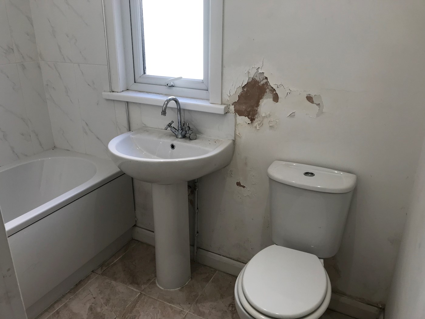 Three piece suite comprising panelled bath with shower attachment over, pedestal wash hand basin, low level w/c, double glazed obscure window to side, smooth ceiling with ceiling lighting, partially tiled walls, vinyl flooring.