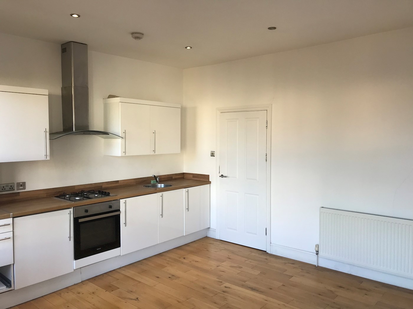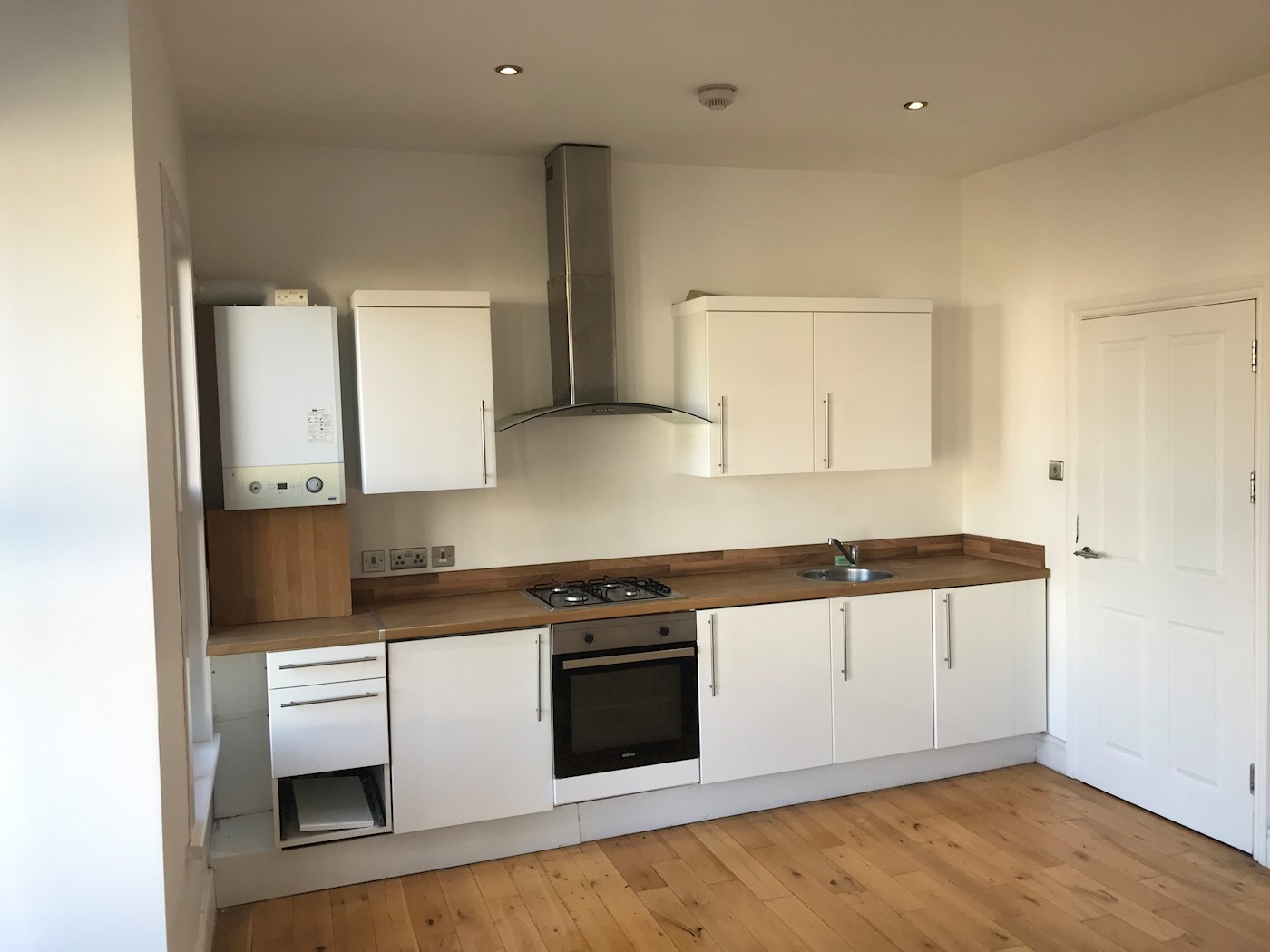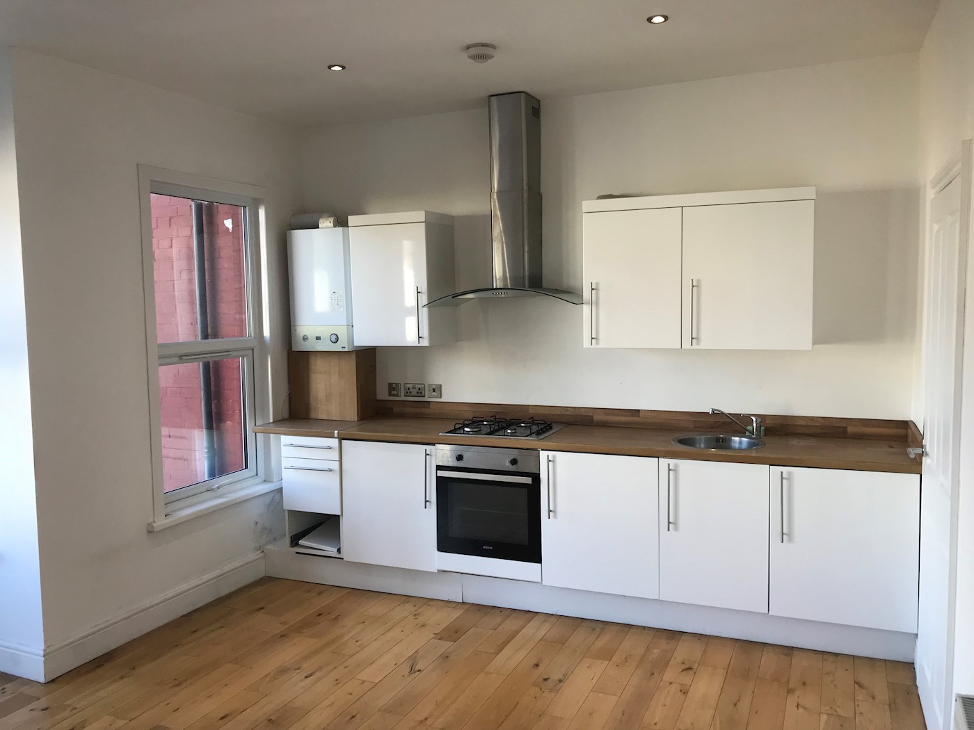 Range of wall and base level units with roll top work surfaces above incorporating inset stainless steel sink with mixer tap, integrated four ring gas hob with extractor unit over, integrated oven, boiler wall mounted, double glazed box bay window to front, further double glazed window to front, smooth ceiling with fitted spotlights, radiator, laminate flooring.