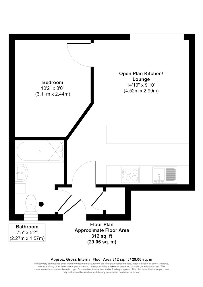 A one bedroom flat on the upper ground floor of a four storey semi-detached building of tradtional construction. The flat is arranged as an open plan living room/kitchen, bedroom and bathroom/WC. In total there are six flats within the building.