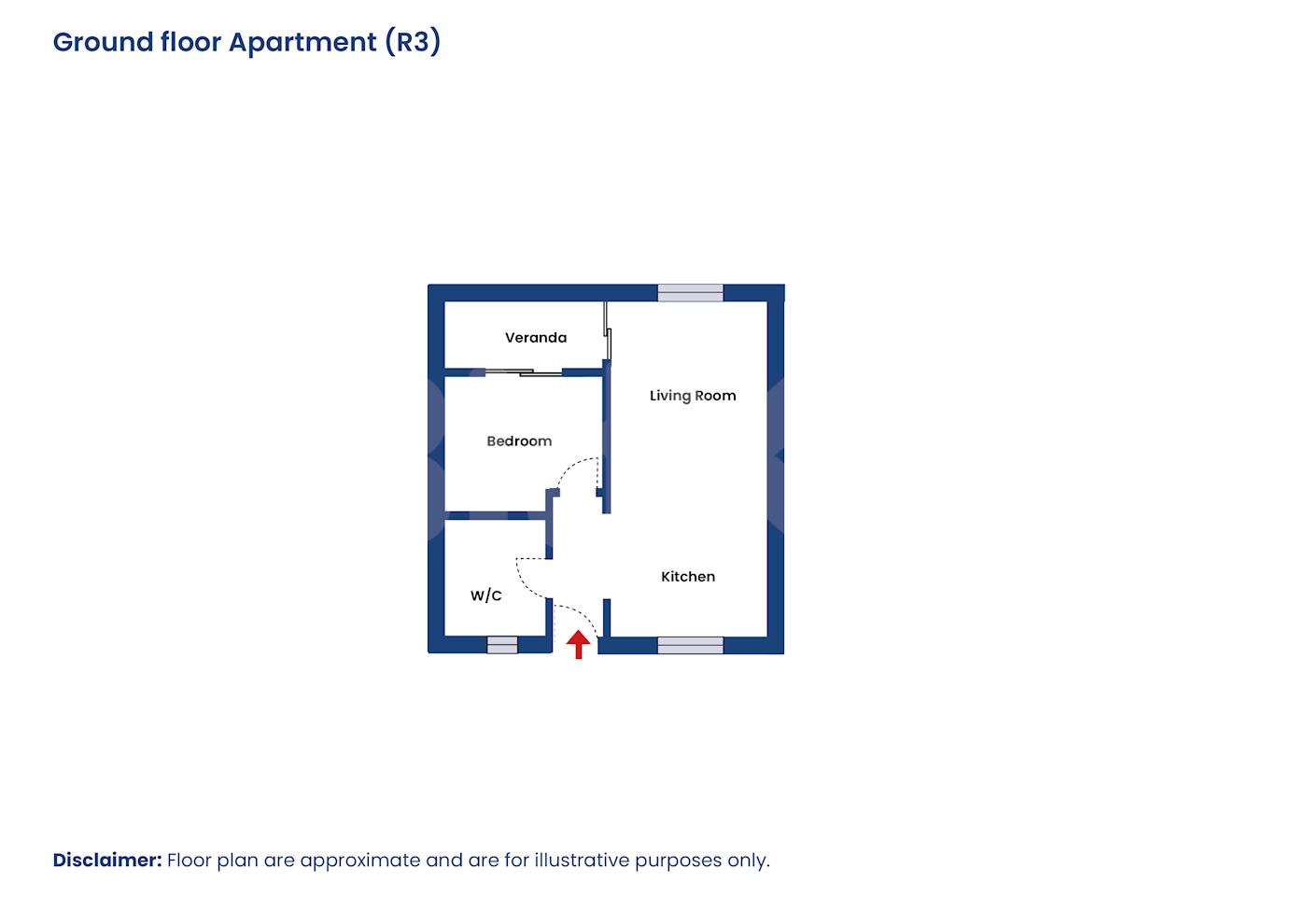 • A one-bedroom apartment on ground floor with door no. R3.