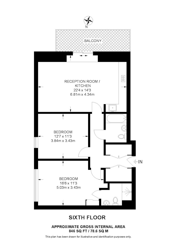 Sixth floor: reception room/kitchen, two bedrooms, en-suite shower room, bathroom, balcony.