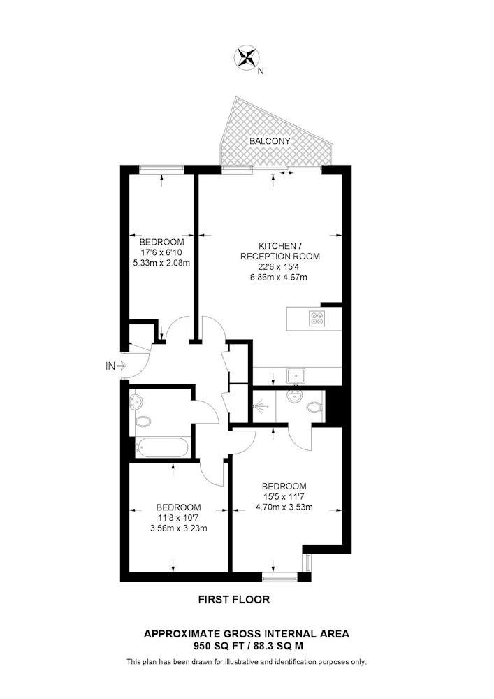 This brilliant three bedroom flat on the first floor is bright and spacious throughout featuring a large open-plan kitchen and reception room looking onto a private balcony, three well-sized bedrooms, main with an en-suite bathroom.